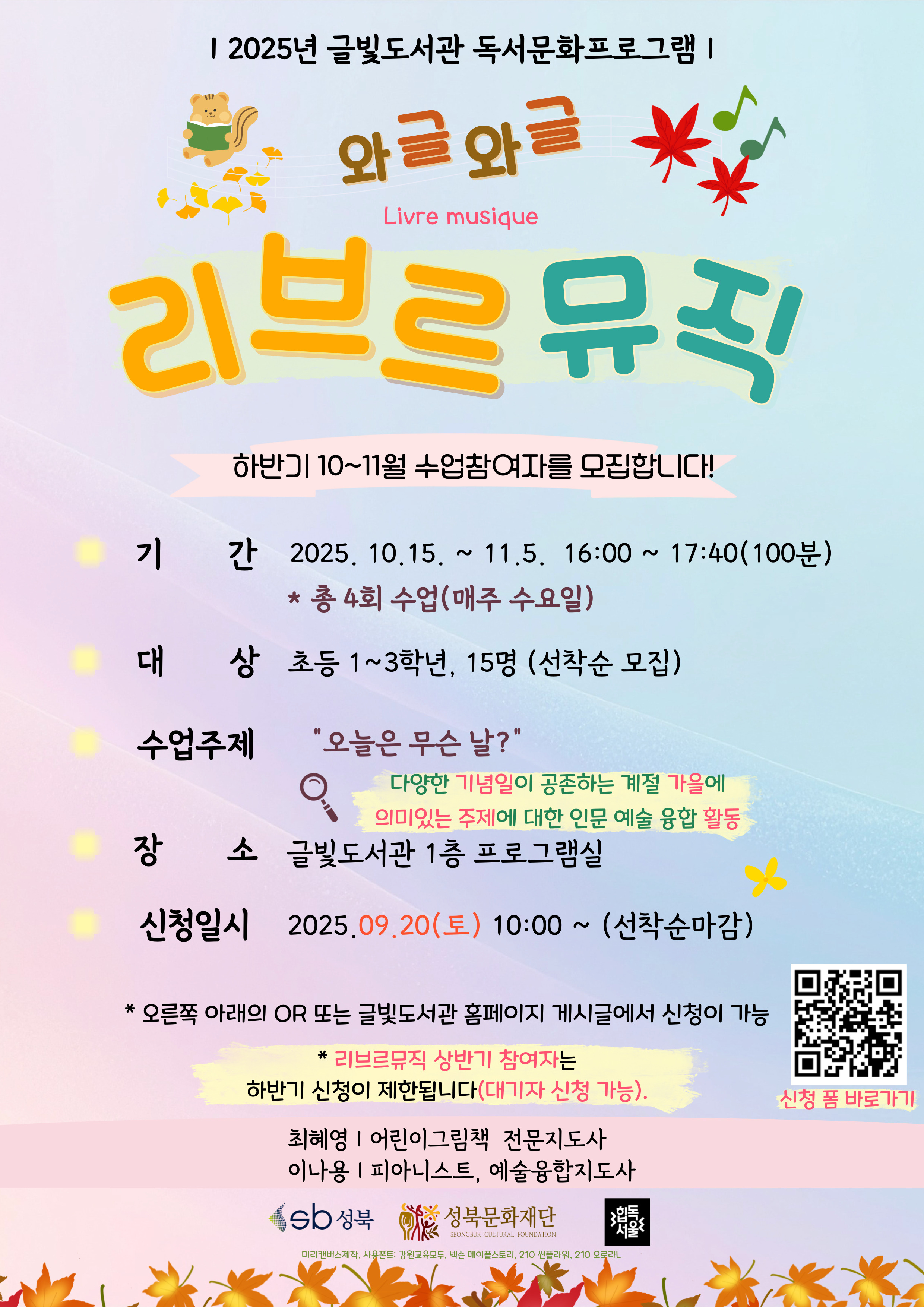 ▷ 일 시 : 2025. 10. 15. ~ 11. 05. 매주 수요일 (총 4회) 오후 4:00 ~ 5:40(100분) ▷ 장 소 : 글빛도서관 프로그램실 ▷ 대 상 : 초등학교 1~3학년 이라면 누구나! ▷ 모집인원 : 총15명 (선착순 모집!) ▷ 내 용 : 와글와글 <리브르 뮤직> 하반기 2회기 수업은 다양한 기념일이 공존하는 계절 ‘가을(10~11월)'에 의미 있는 주제에 대한 인문 예술 융합 활동으로 어린이(초등학교 1~3학년) 여러분과 함께하고자 합니다! ▷ 접 수: 2025. 9. 20(토) 오전10시 ~