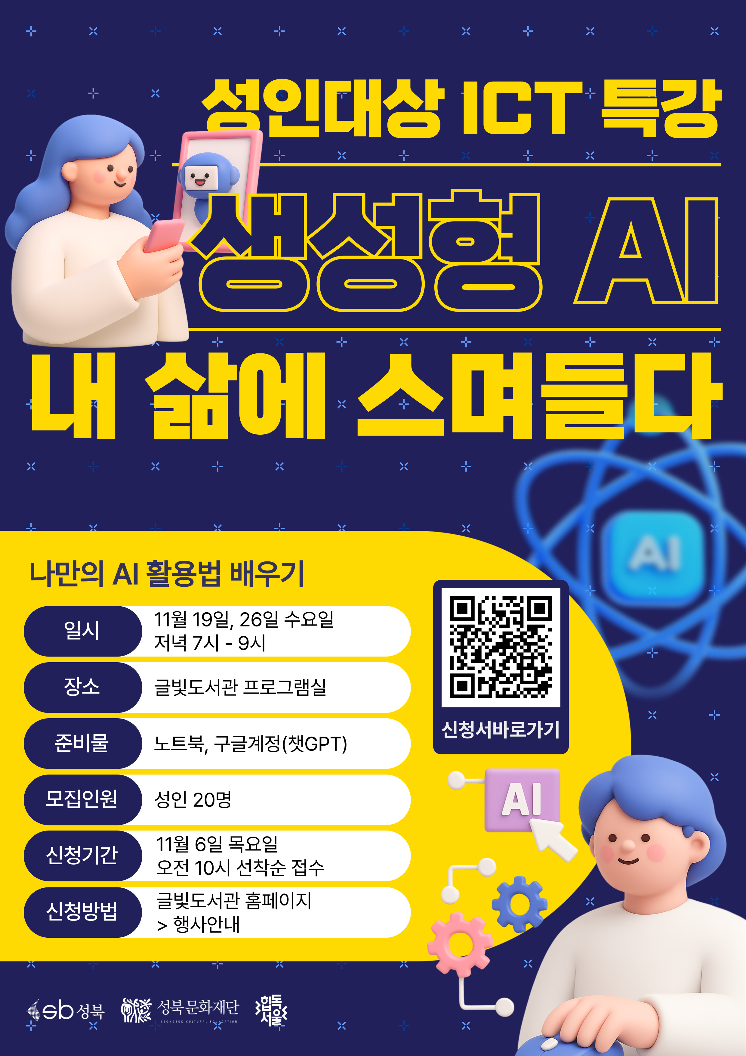 드디어 성인을 위한 ICT 프로그램이 진행됩니다. 지금 가장 핫한 ICT 기술은 무엇일까요? 바로 생성형 AI입니다. 수요일 저녁 함께 생성형 AI에 대해 알아보는 시간을 가져보아요!