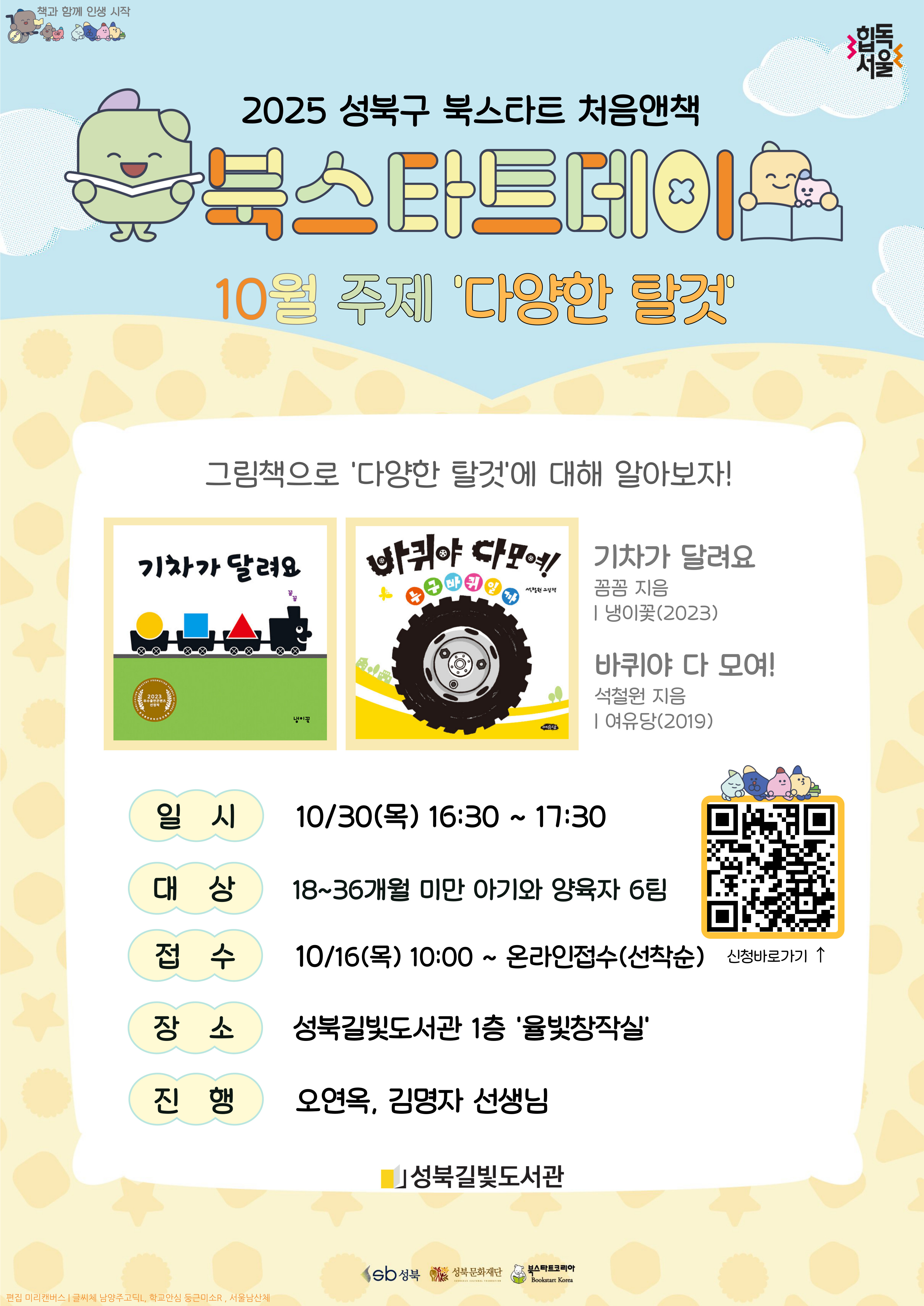 일시 l 10/30목) 16:30-17:30 대상 l 18~36개월 미만 아기와 양육자 6팀 장소 l 성북길빛도서관 1층 율빛창작실 접수 l 2025.10.16.(목) 10:00~ 선착순 접수 신청 l 클릭하면 접수폼으로 넘어갑니다:)