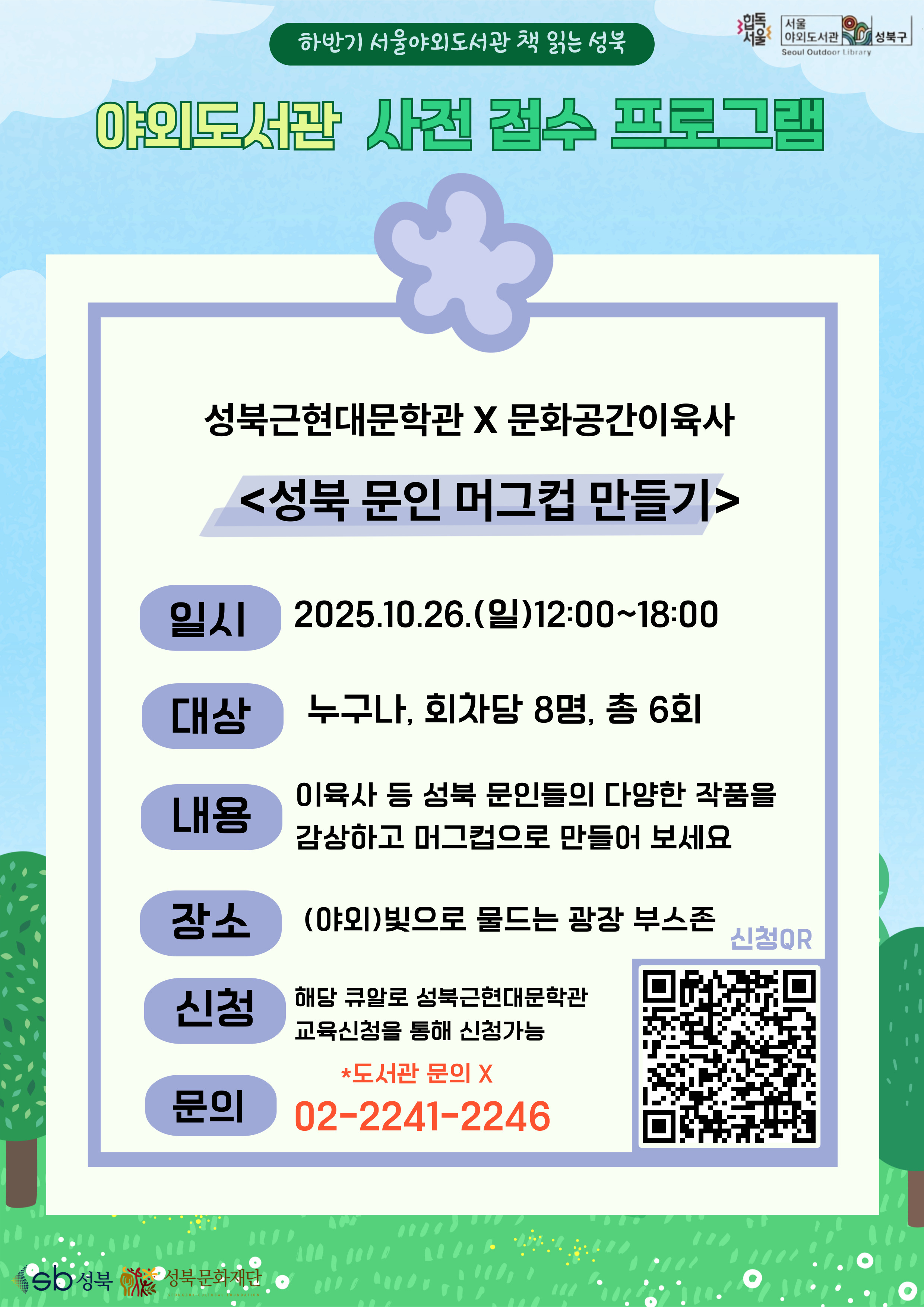 제목 | [모집중] 하반기 야외도서관 <성북 문인 머그컵 만들기> 사전신청 |