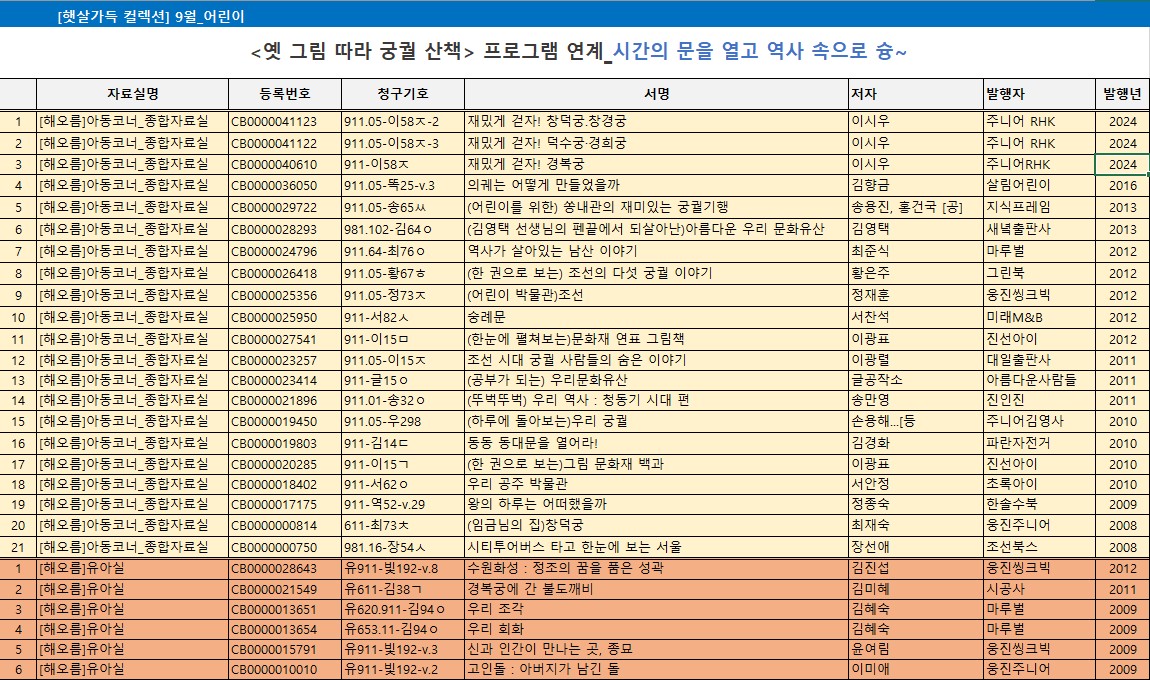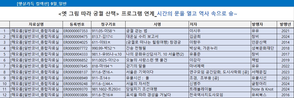 전 시 명: 시간의 문을 열고 역사 속으로 슝~ 전시내용: <옛 그림 따라 궁궐 산책> 프로그램 연계 주제도서 전시 전시기간: 2025.09.01. ~ 2025.10.31.