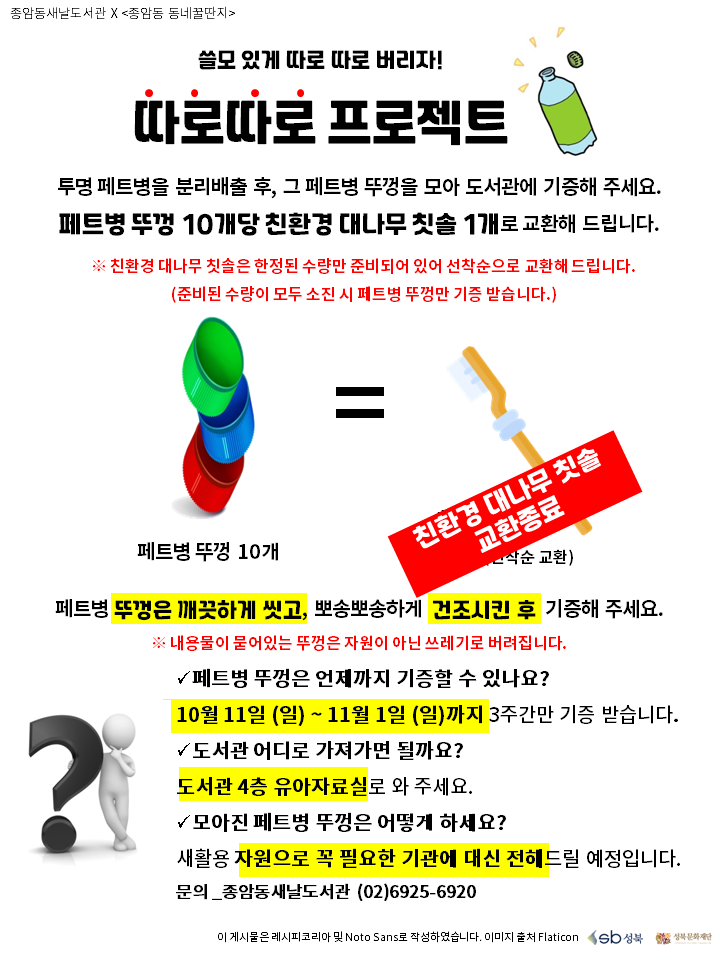 코로나19로 비대면, 특히 택배 이용이 증가하며 재활용 쓰레기에 대한 문제가 더욱 더 심각해지고 있는데요. 올바른 분리배출, 분리수거는 쓰레기를 줄일 뿐만 아니라 고품질의 자원으로 순환시킬 수도 있답니다. 쓸모 있게 따로 따로 버리자! 프로젝트 장소 : 종암동새날도서관 4층 유아자료실 프로젝트 내용 종암동과 종암동새날도서관을 사랑하는 여러분의 많은 참여 부탁드립니다. 문의_종암동새날도서관 (02)6925-6920