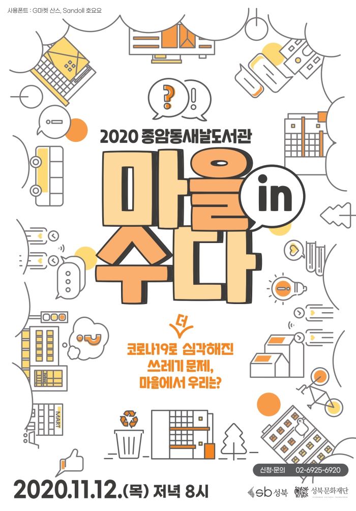 2020 종암동새날도서관 마을in수다 코로나19로 더 심각해진 쓰레기 문제, 마을에서 우리는? 코로나19로 택배, 배달 음식 이용이 증가하며 발생된 쓰레기 문제는 이제 먼 곳이 아닌 여러분의 따뜻한 관심과 많은 응원 부탁드립니다.
