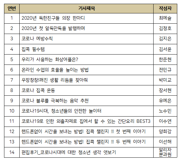 | 제목 | [독한친구들_알리자] 청소년신문_알독만독_2020_가을호_기획특집_코로나시대의 슬기로운 청소년 생활 | ||