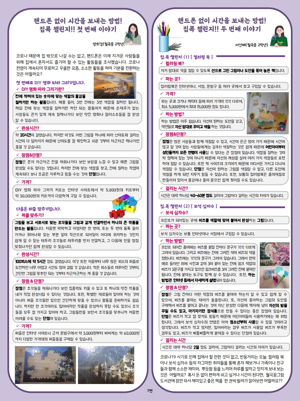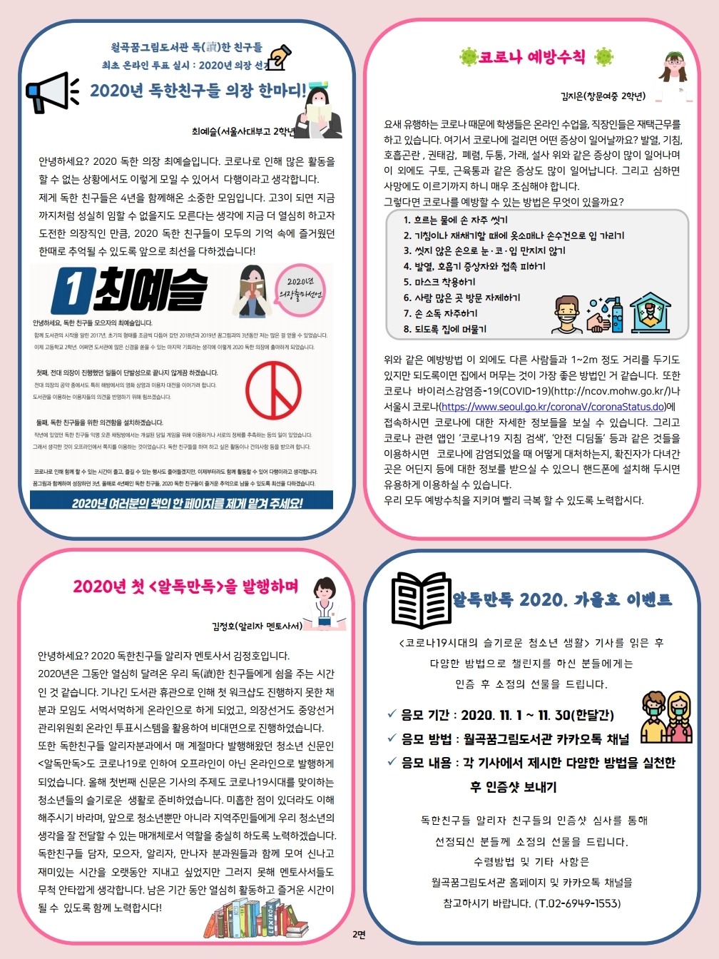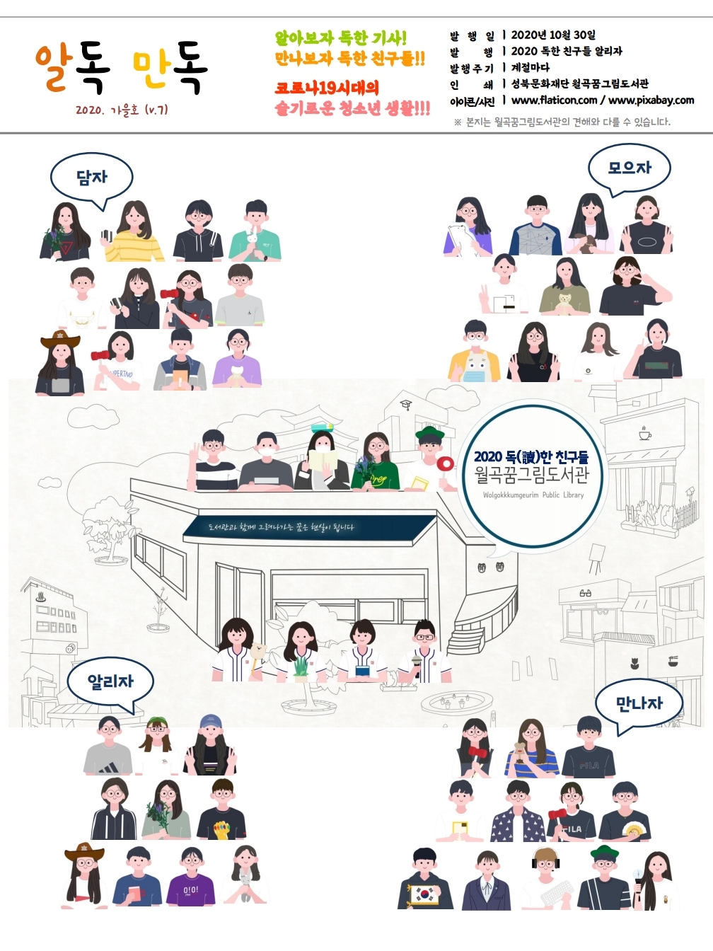 월곡꿈그림도서관 청소년 자치활동모임인 독(讀)한 친구들 알리자 분과에서 발행하는 청소년 신문 <알독만독> 제7호(2020년 가을호)가 나왔습니다.