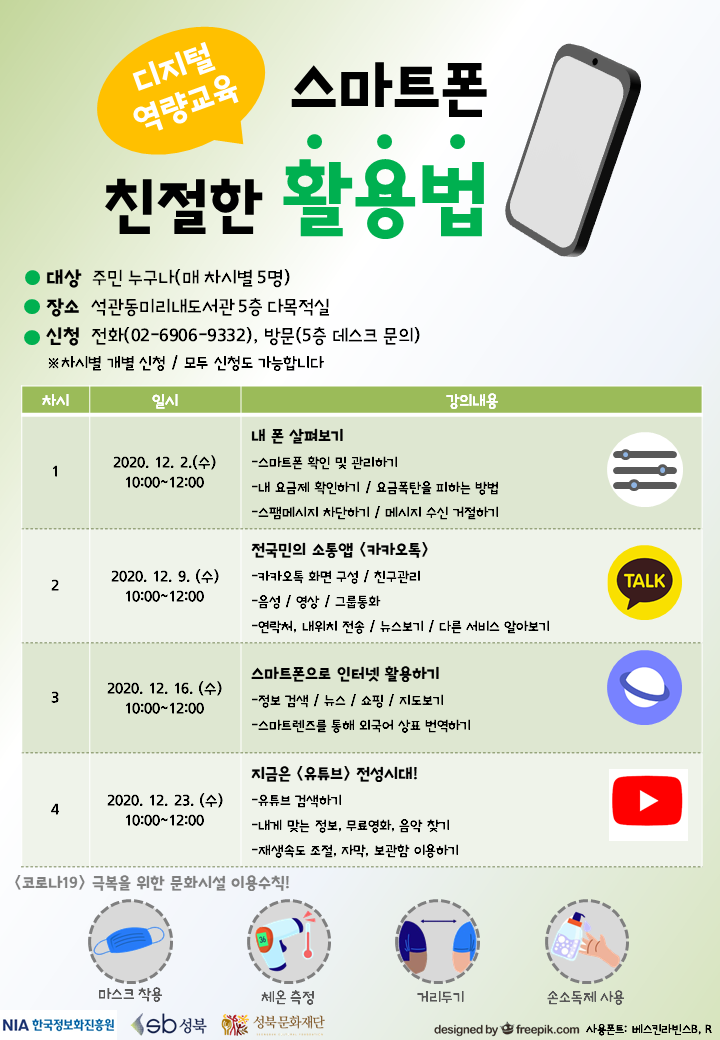 디지털역량교육 <스마트폰 친절한 활용법> 운영 코로나로 인해 비대면 프로그램이 많아지는 지금, 여러가지 강좌나 프로그램은 좋은데 아직은 스마트폰이 낯설다면..? 스마트폰 기본 설정부터 유튜브까지, 스마트폰과 좀더 친해지고 나의 스마트폰을 더 많이 활용해볼 수 있는 방법이 무엇일지 알아보아요~! -일시: 12. 2. ~ 12. 23. 매주 수요일 10:00~12:00 (총 4회)