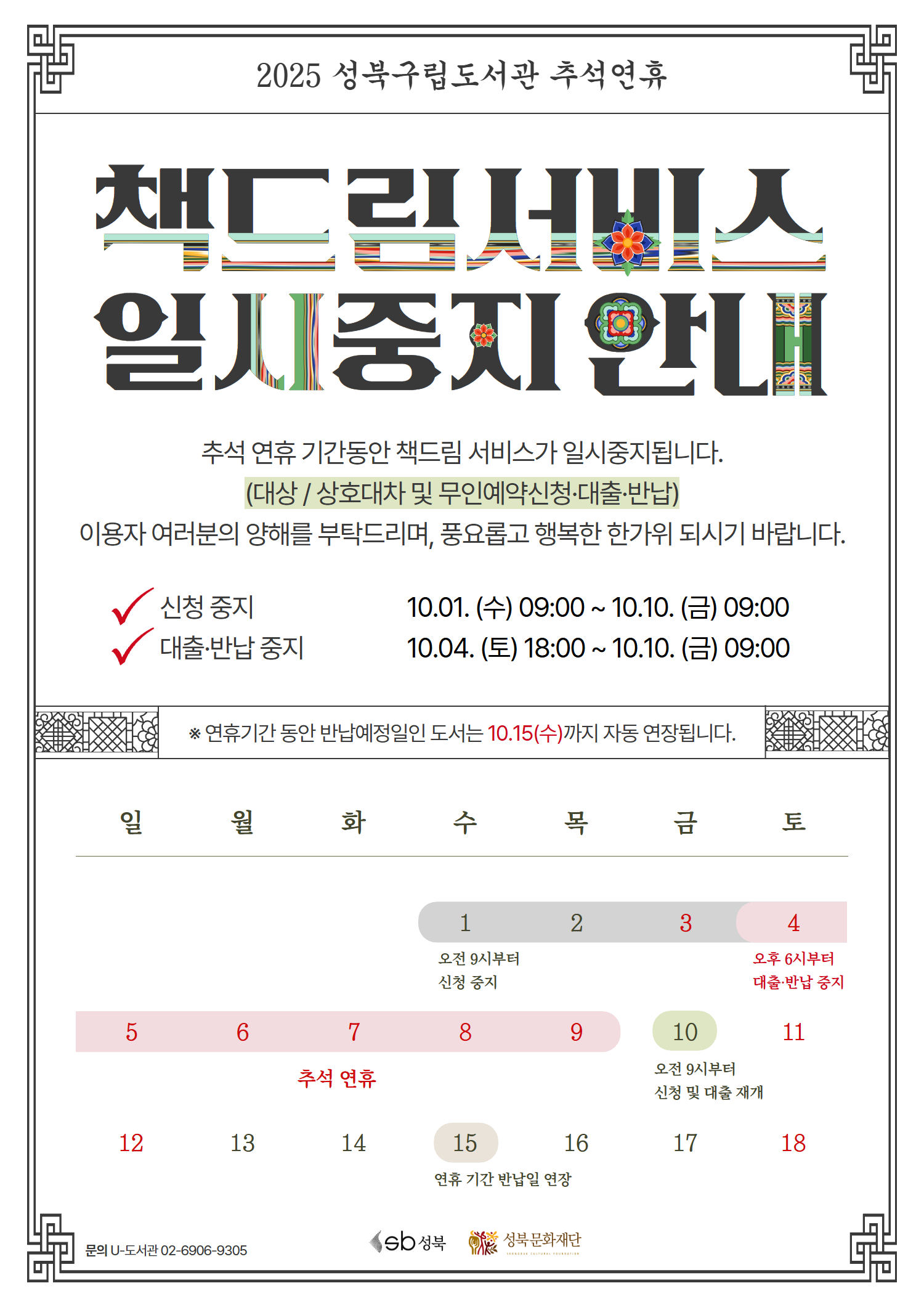 ▶ 추석연휴 및 휴관 / 10.05.(일) ~ 10.09.(목) - 상호대차·무인예약 온라인 신청중지 기간 / 10.01.(수) 9시 ~ 10.10.(금) 9시 - 도서반납 중지 기간 / 10.04.(토) 18시 ~ 10.10.(금) 9시 - 반납예정일 10.05.(일) ~ 10.14.(화) 도서는 10.15.(수)로 일괄 연장