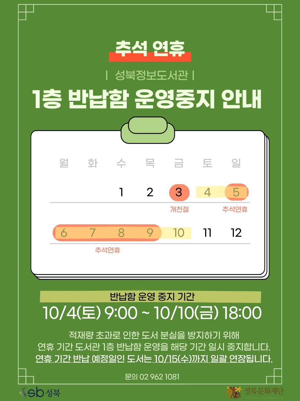 [안내] 2025 추석 연휴기간 성북정보도서관 1층 무인반납함 운영 중지