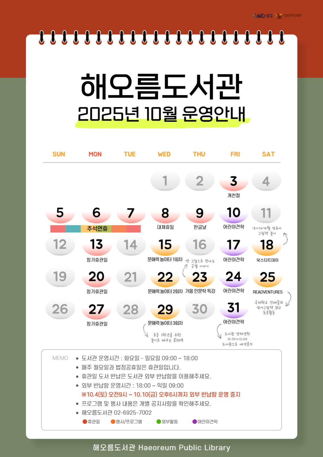 ■ 해오름도서관 10월 운영 안내 - 정기휴관일: 13(월), 20(월), 27(월) - 법정공휴일: 3(금) 개천절, 5(일)~7(화) 추석연휴, 8(수) 대체휴일, 9(목) 한글날 - 매주 월요일은 정기휴관일입니다. - 그 외 도서관 쉬는 날은 일요일을 제외한 법정공휴일, 근로자의 날, 기타 관장이 필요하다고 인정되는 경우의 날 - 행사 및 프로그램 안내는 개별 공지를 확인해 주시기 바랍니다.