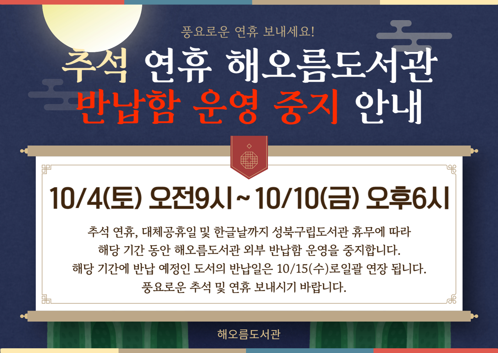 ■ 휴관일 자료 반납 안내 * 도서관 휴관일에 자료 반납은 1) 각 지하철역 무인 반납기 2) 해오름도서관(또는 성북구립도서관) 앞 도서반납함을 이용해주세요. ※ 10.4(토) 오전9시 ~ 10.10(금) 오후6시까지 외부 도서반납함 이용 중지 도서반납함 적재량 초과 및 도서 분실을 방지하기 위함 해당 기간에 반납 예정인 도서의 반납 예정일은 10.15(수)로 자동 연장