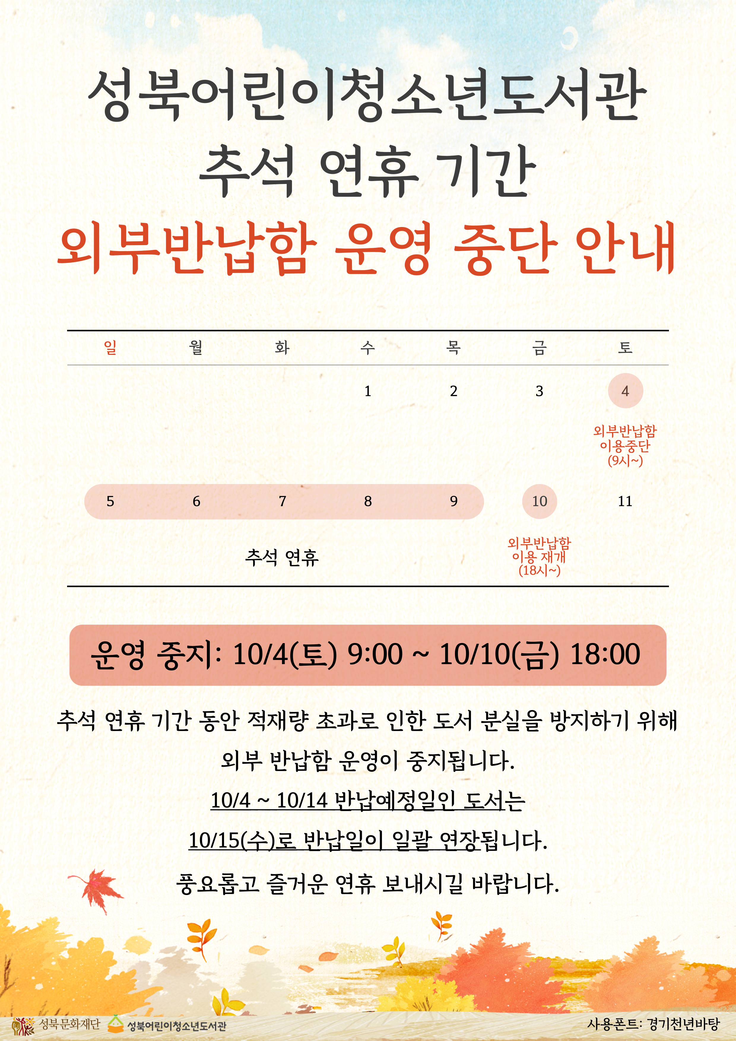 [안내] 성북어린이청소년도서관 추석연휴 기간 외부반납함 운영 중단 안내