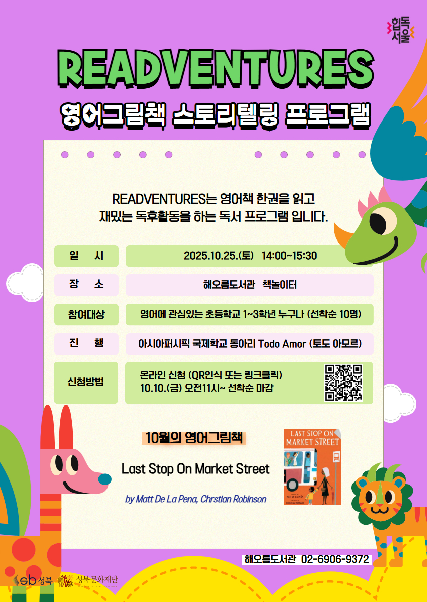 - 진행일시: 2025. 10. 25. (토) 오후 2시 ~ 오후 3시 30분 - 신청방법: 온라인 신청(QR인식 또는 링크클릭) 신청링크 - https://forms.gle/aDrwF46nEgg2jQ7V8 - 진행장소: 해오름도서관 책놀이터 - 참여대상: 초등학교 1-3학년 10명 - 진 행 자: Todo Amor (아시아 퍼시픽 국제학교 동아리) 고등학생 - 진행내용: 영어 그림책 함께 읽고, 연계 독후활동 진행 - 문 의: 해오름도서관 02-6906-9372 ※ 본 프로그램은 청소년 재능기부 프로그램으로 진행자 학교일정 등에 의해 진행날짜가 변경될 수 있습니다. |