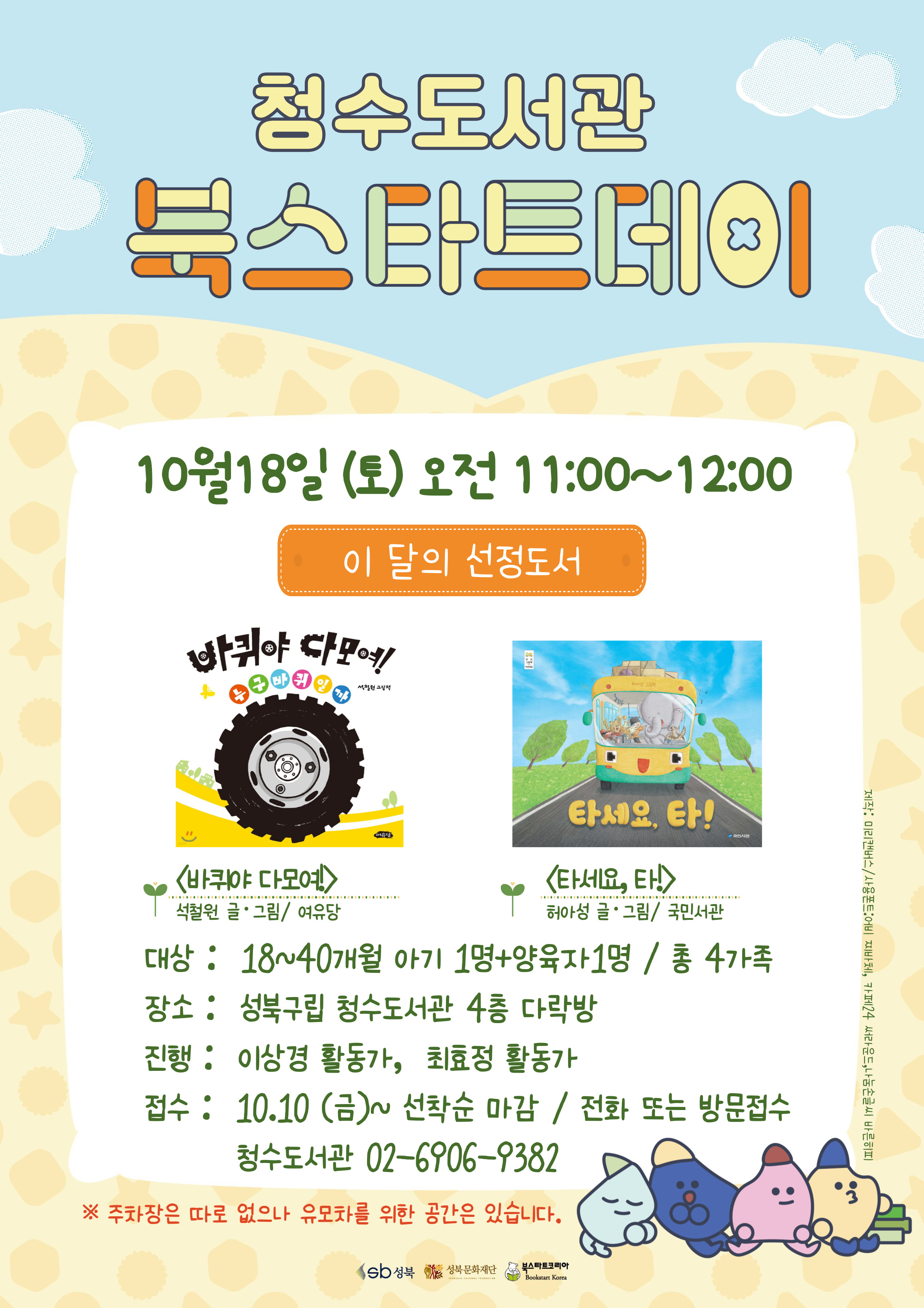 청수도서관에서 10월 영유아 책놀이 프로그램에 참여할 가족을 모집합니다~! 책을 처음으로 접하는 영유아들이 책을 즐겁게 기억할 수 있도록 아래 내용을 잘 살펴보시고 전화 또는 방문신청(청수도서관 1층 일반자료실) 바랍니다. [청수도서관 10월 북스타트데이 안내] 1. 대상: 18~40개월 아기1명+양육자1명 팀으로 총 4팀 청수도서관 02-6906-9382