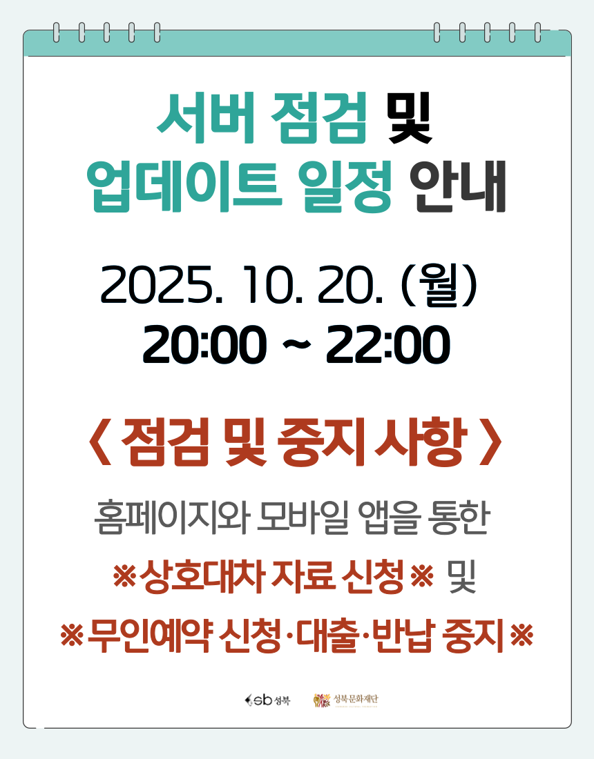 성북구립도서관 홈페이지 서버 업데이트 및 점검안내 ※점검일시 : 2025. 10. 20.(월) 20:00 ~ 22:00