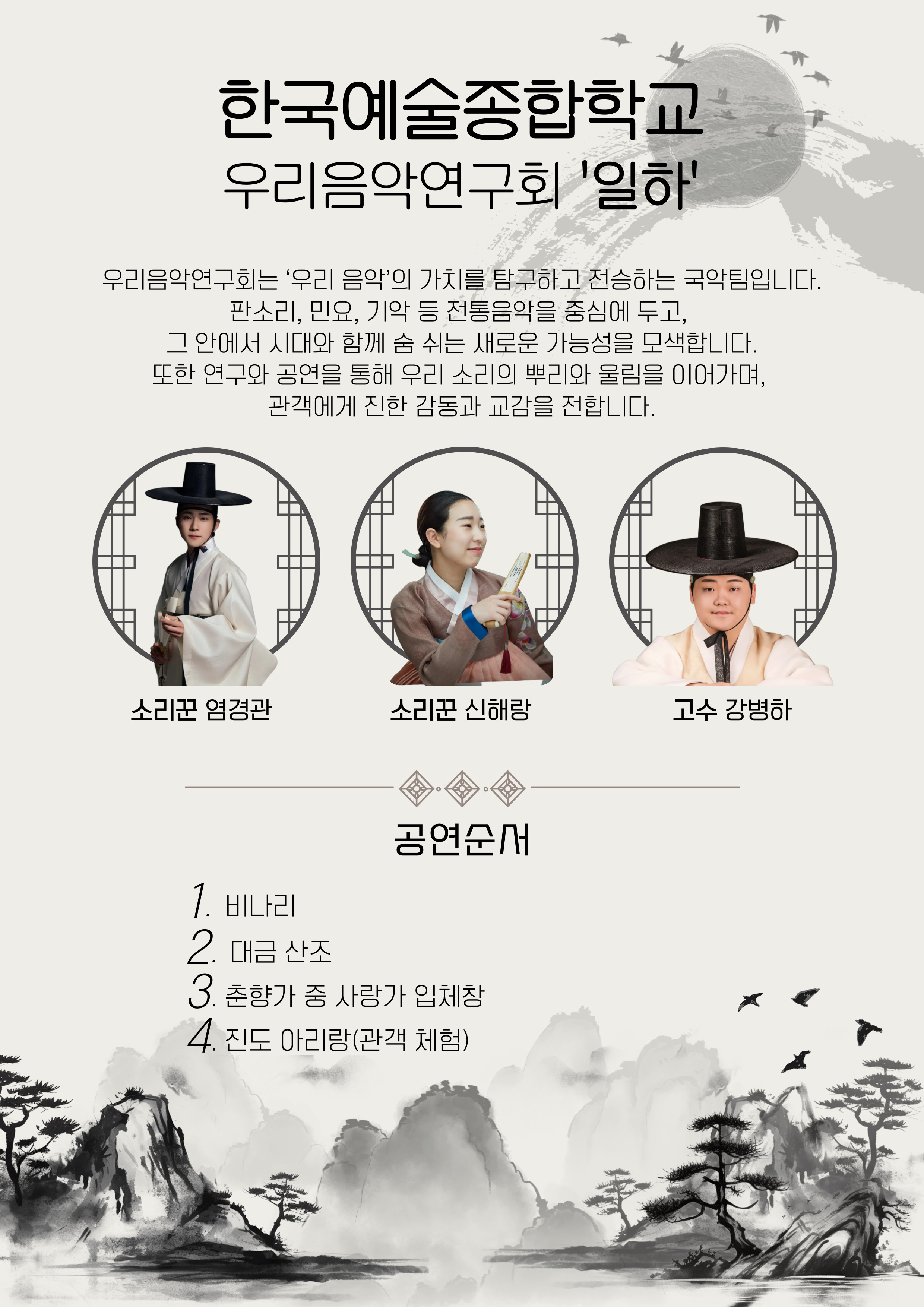 풍성한 가을의 정취가 가득한 주말 오후, 야외 도서관 메인 무대에서 우리 고유의 흥과 멋이 담긴 국악의 선율이 울려 퍼집니다. * 한국예술종합학교 우리음악연구회 '일하'는 ‘우리 음악’의 가치를 탐구하고 전승하는 국악팀입니다. *