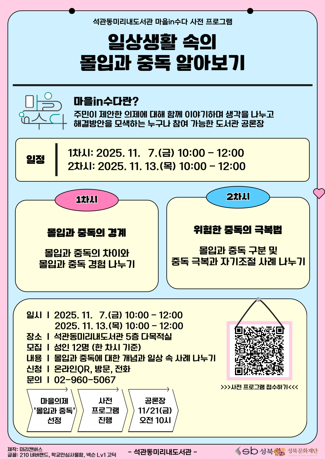 제목 | [모집중] 석관동미리내도서관 마을in수다 사전 프로그램 <일상생활 속의 몰입과 중독 알아보기> | ||