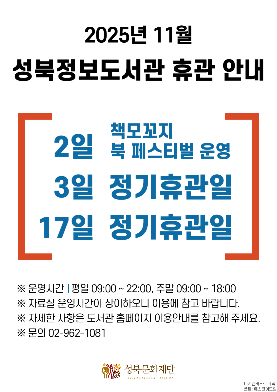 제목 | 성북정보도서관 2025년 11월 휴관일 안내 | ||