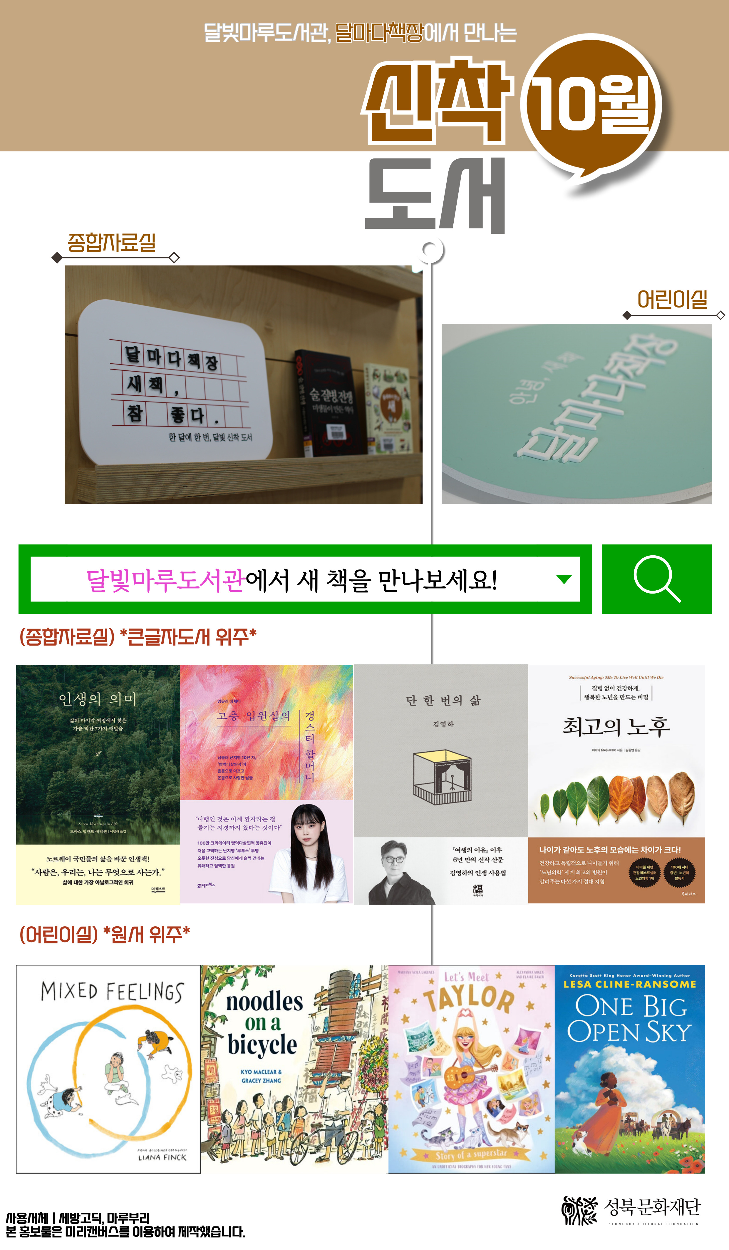 10월 23일(목) 오전 11시 2025년 10월 신착도서가 배가됩니다. 신착도서는 각 자료실의 <달마다 책장> 서가에 비치됩니다! 신착도서 목록은 게시글 상단의 첨부파일을 확인해주세요. ※ 10월 신착도서는 종합자료실은 큰글자도서 위주, 어린이실은 원서책 위주입니다😀