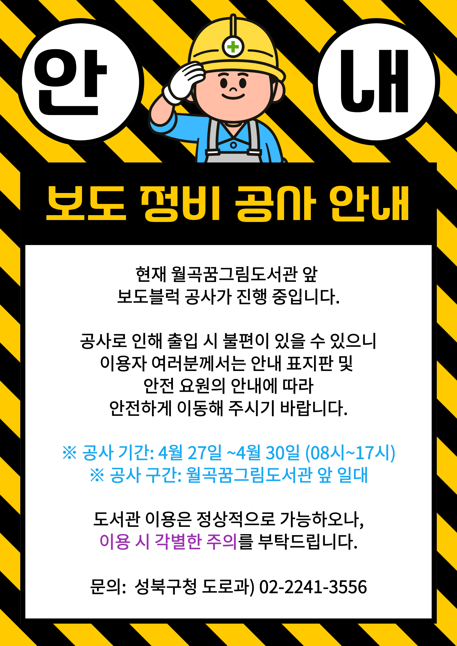 공사기간 : 4월 27일 ~4월 30일 (08시~17시) 공사 위치 : 월곡꿈그림도서관 앞 문의 : 성북구청 도로과) 02-2241-3556