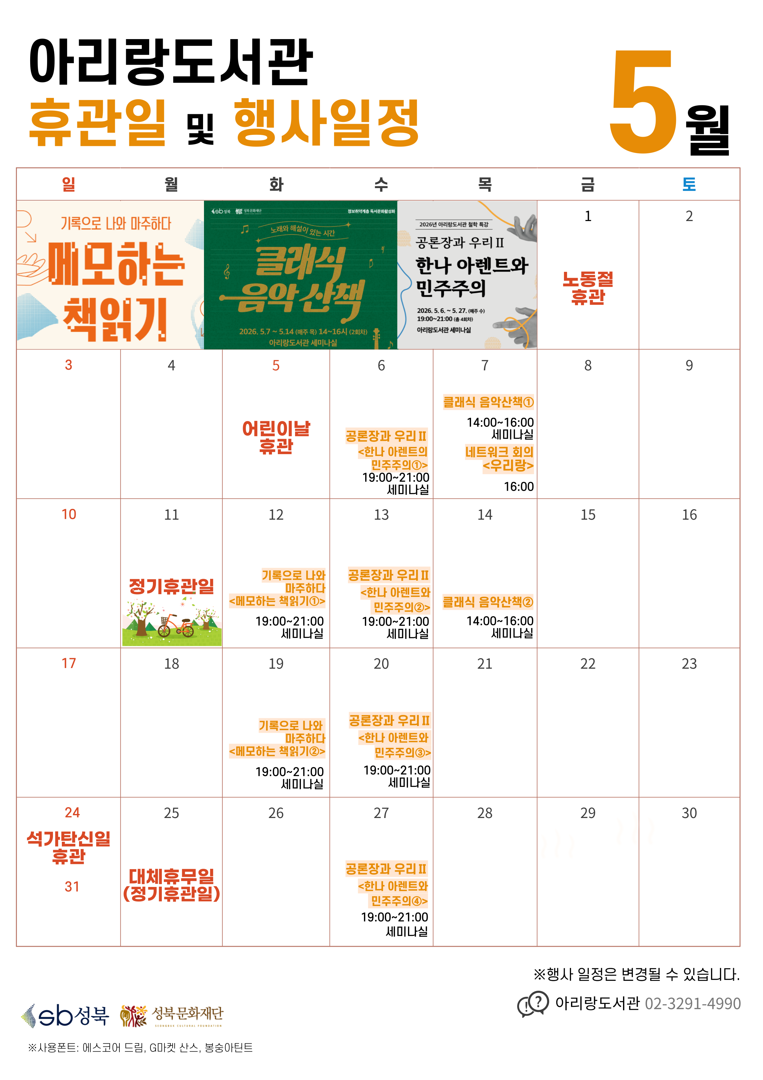 [운영일정]아리랑도서관 5월 휴관일 및 행사일정 안내
