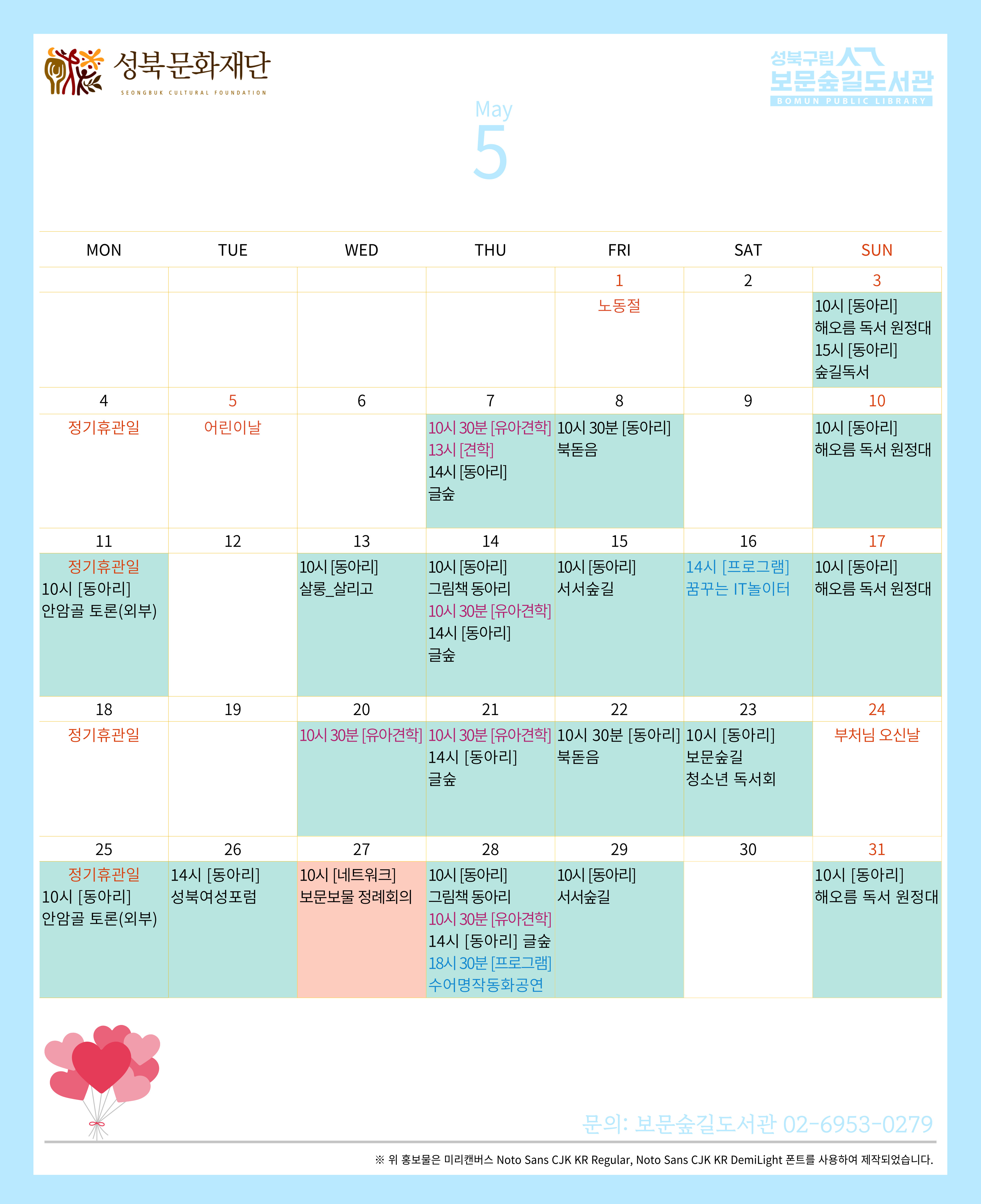 보문숲길도서관 5월 휴관일 및 행사일정 - 정기휴관: 4일, 11일, 18일, 25일(매주 월요일은 정기휴관일, 일요일을 제외한 법정공휴일은 휴무) 1일(노동절), 5일(어린이날), 24일(부처님 오신 날) - 네트워크: 27일 보문숲길도서관 네트워크 보문보물 정례회의 (10:00-12:00) - 동 아 리: 3일, 10일, 17일, 31일 해오름 독서 원정대 동아리 활동 (10:00-12:00) 3일 숲길독서 동아리 활동 (15:00~17:00) 7일, 14일, 21일, 28일 글숲 동아리 활동(14:00-16:00) 8일, 22일 북돋음 동아리 활동 (10:30-12:30) 11일, 25일 안암골 토론 동아리 활동(10:00-12:00) 13일 살롱_살리고 동아리 활동 (10:00-12:00) 14일, 28일 그림책동아리 활동 (10:00-12:00) 15일, 29일 서서숲길 동아리 활동(10:00~12:00) 23일 보문숲길 청소년 독서회 (10:00-12:00) 26일 성북여성포럼 동아리 활동 (14:00-17:00) - 유아견학: 7일, 14일, 20일, 21일, 28일 유아견학 진행 (10:30-11:30) - 견 학: 7일 견학 진행 (13:00-15:00) - 프로그램: 16일 꿈꾸는 IT놀이터 프로그램 진행 (14:00-16:00) 28일 수어명작동화공연 프로그램 진행 (18:30-19:30)