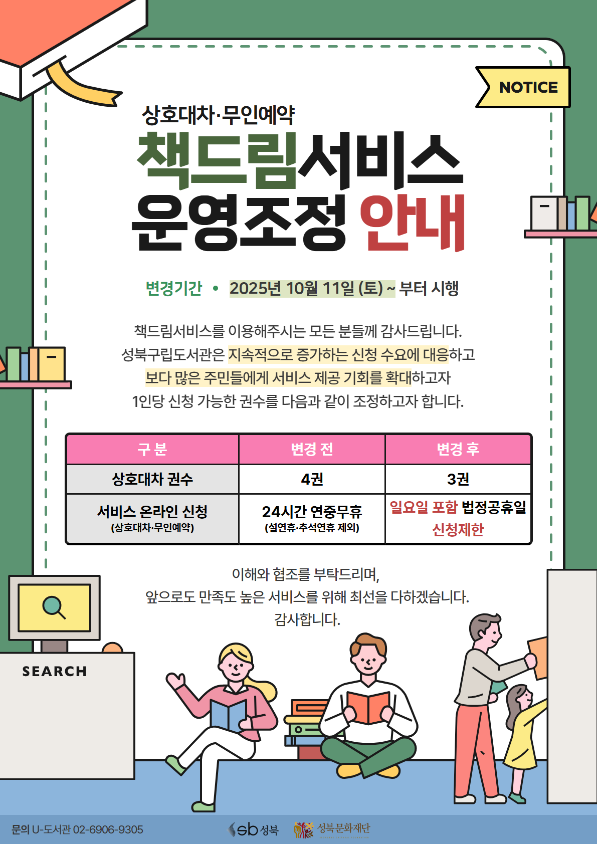 지속적으로 증가하는 서비스 신청 수요에 대응하고 보다 많은 주민들에게 서비스 제공 기회를 확대하고자 원활하고 안전한 책드림 서비스 운영을 위해 다음과 같이 운영을 조정하고자 합니다.