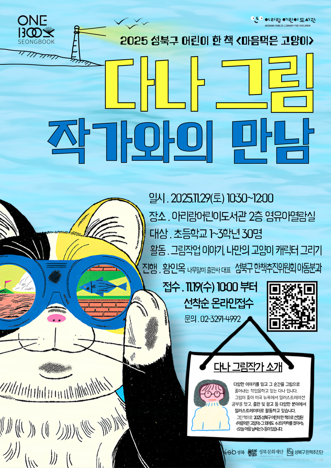 일시: 2025.11.29 토요일 10:30~12:00 장소: 아리랑어린이도서관 2층 영유아열람실 대상: 초등학교 1~3학년 30명 활동: 그림작업 이야기, 나만의 고양이 캐릭터 그리기 진행: 황인옥(나무말미 출판사), 성북구 한책추진위원회 아동분과 접수: 11.19(수) 10:00부터 선착순 온라인 접수 (상단 포스터의 QR 코드 스캔 또는 접수하기를 클릭해주세요!!) 접수하기!! <- 클릭 문의: 02-3291-4992