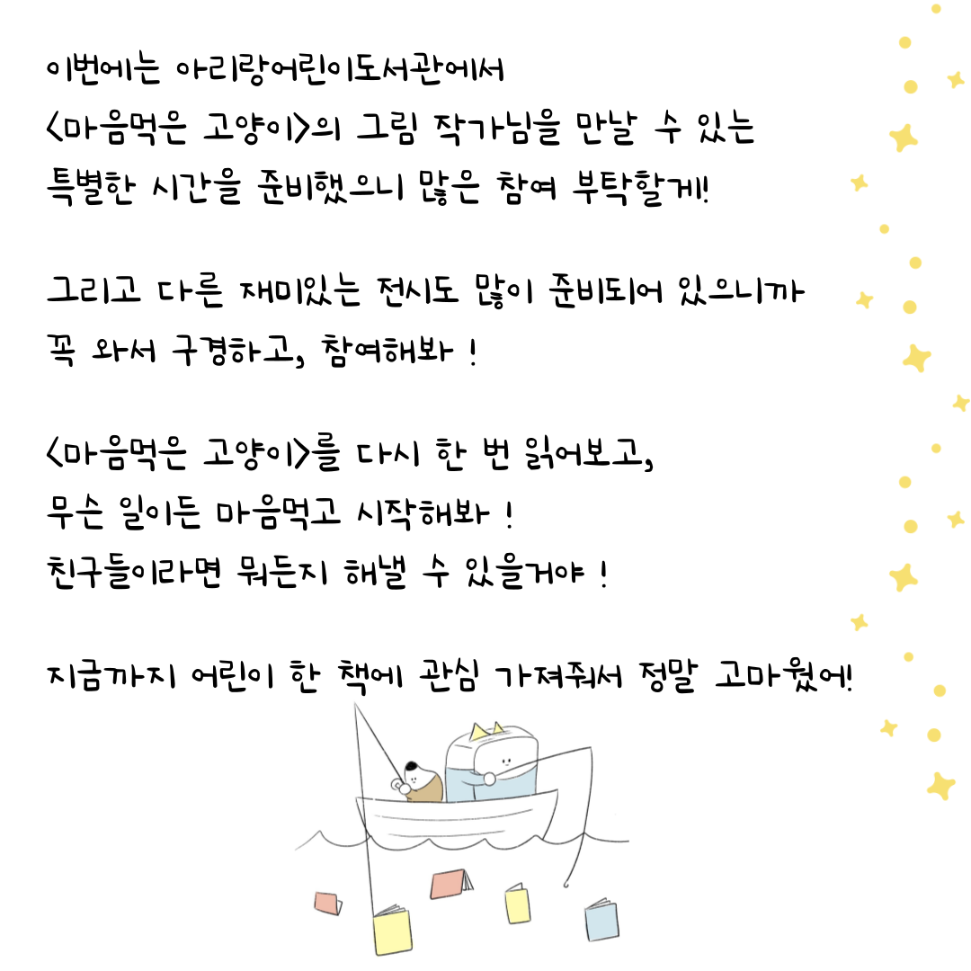 아리랑어린이도서관에서 <마음먹은 고양이>의 그림책 작가님을 만나고, 다양한 전시와 체험에 참여해보세요~!