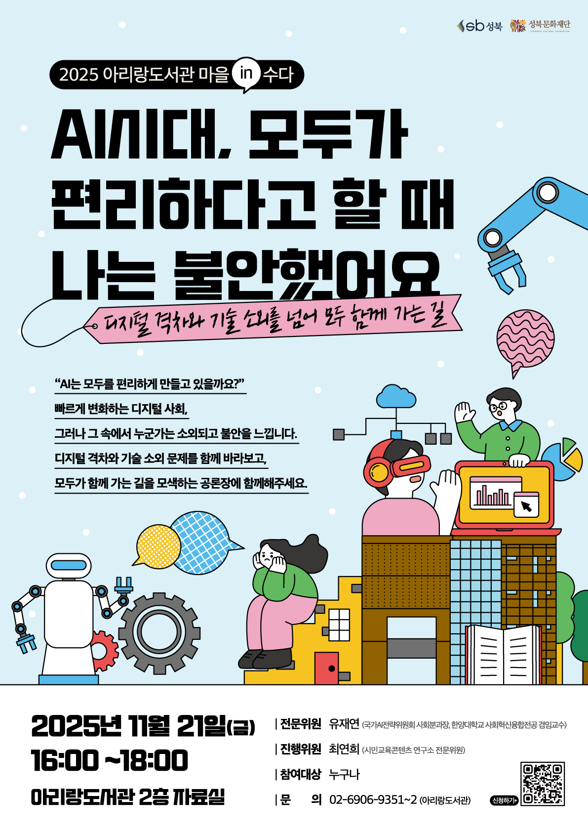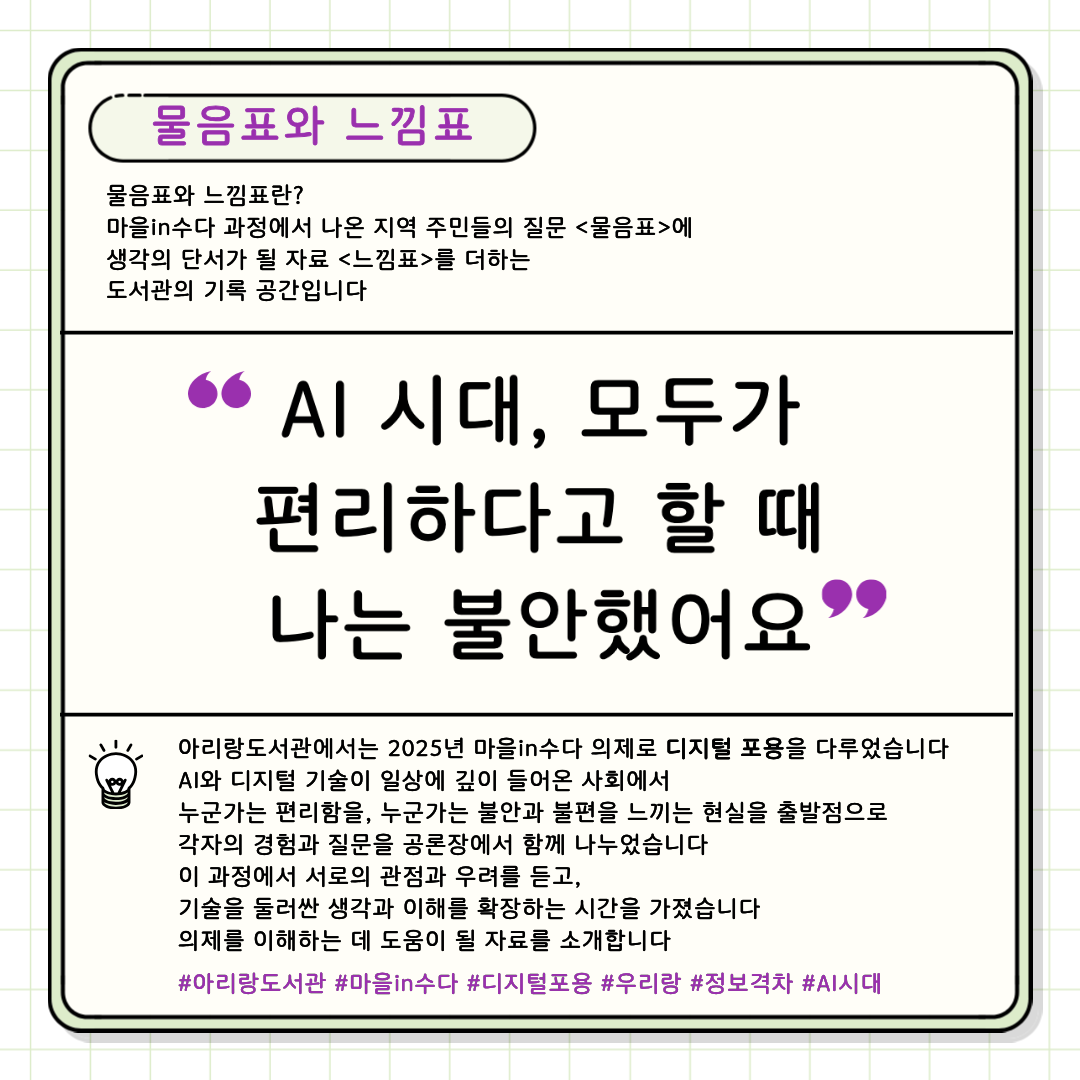 아리랑도서관에서는 2025년 마을in수다 의제로 디지털 포용을 다루었습니다 #아리랑도서관 #마을in수다 #디지털포용 #우리랑 #정보격차 #AI시대