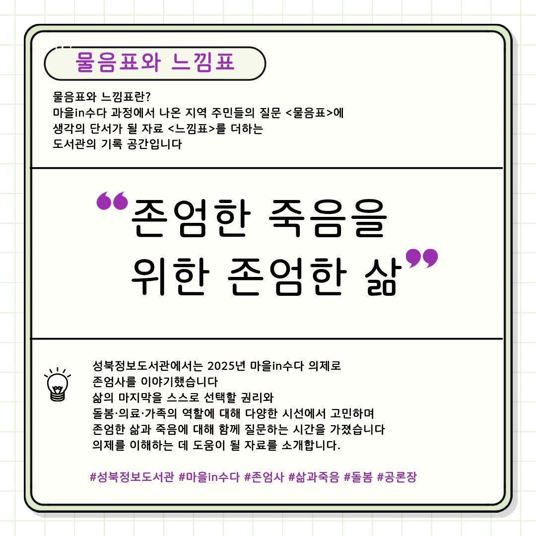 존엄한 죽음을 위한 존엄한 삶 성북정보도서관에서는 2025년 마을in수다 의제로 존엄사를 이야기했습니다. 삶의 마지막을 스스로 선택할 권리와 돌봄, 의료, 가족의 역할에 대해 다양한 시선에서 고민하며 존엄한 삶과 죽음에 대해 함께 질문하는 시간을 가졌습니다. 의제를 이해하는데 도움이 될 자료를 소개합니다. #성북정보도서관 #마을in수다 #존엄사 #삶과죽음 #돌봄 #공론장