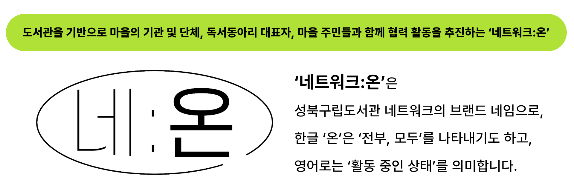 성북구립도서관은 도서관을 중심으로 주민, 민간단체, 유관기관, 학교 등 주민 주체들과 함께 마을의 자원과 정보를 공유하고 활동하는 ‘도서관 네트워크’를 운영하고 있습니다.
