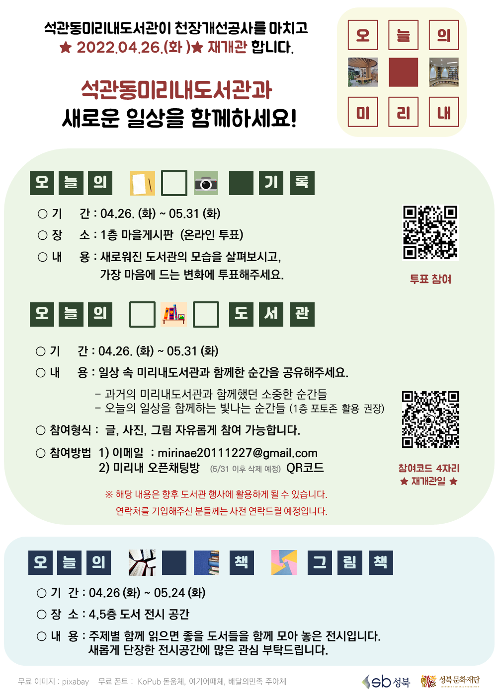석관동미리내도서관 재개관 행사는 아래 내용을 참고해주세요.
