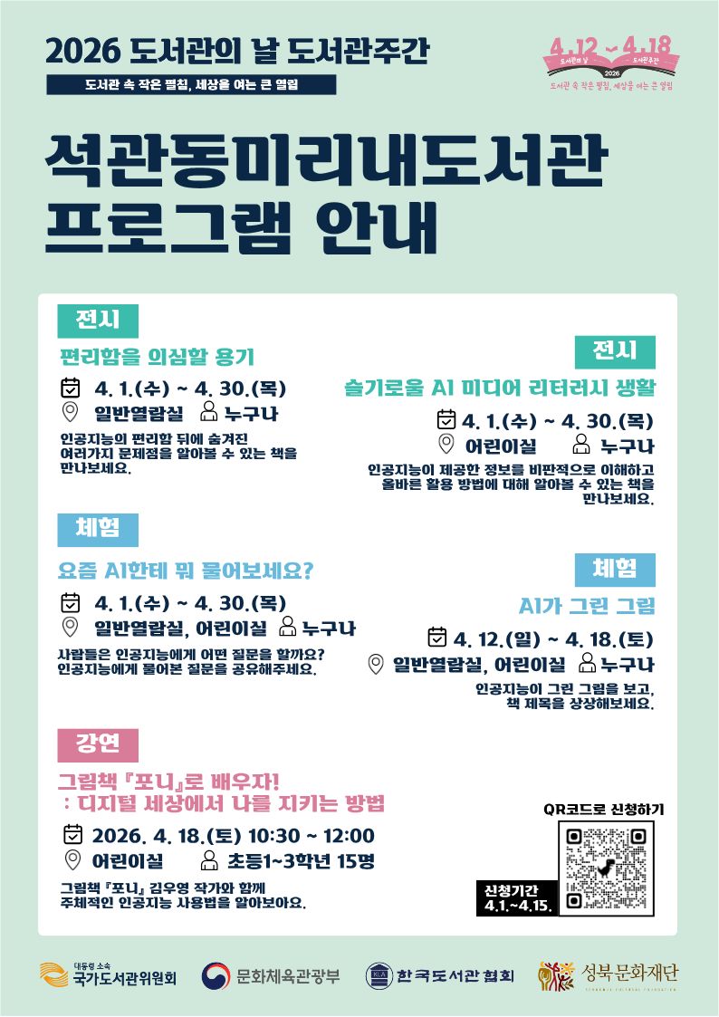 ○ 일 시: 2026.4.18.(토) 10:30 ○ 장 소: 석관동미리내도서관 어린이실 ○ 대 상: 초등 1~3학년 15명 ○ 내 용: 그림책 『포니』 김우영 작가와 함께 주체적인 인공지능 사용법을 알아보아요. ○ 신청방법: QR코드 스캔 또는 신청하기 클릭 |