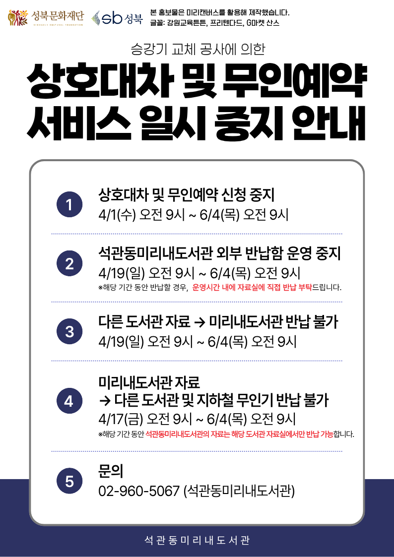 📍석관동미리내도서관 1층 외부 반납함 운영 중지 2026. 4. 19.(일) 09:00 ~ 2026. 6. 4.(목) 09:00 ※해당 기간 동안 석관동미리내도서관의 도서를 반납할 경우, 도서관 운영 시간 내에 각 자료실로 직접 반납 부탁드립니다.
