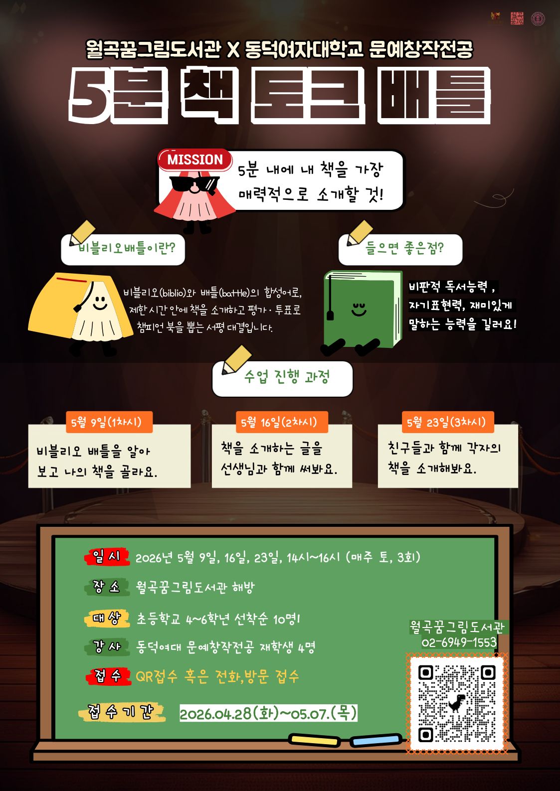 5분 안에 내가 읽은 책으로 사람들의 마음을 뺏어라! 🕒🔥 읽기만 하던 친구 환영! 말하기와 글쓰기 실력을 한번에 UP UP! 🗓️ 일시: 5월 9일(토), 16일(토), 23일(토) / 14:00~16:00 🎈 장소: 월곡꿈그림도서관 해방 😁 대상: 초등학교 4-6학년 선착순 10명 📝 접수: QR 스캔, 방문, 전화접수 모두 가능!/ <신청바로가기> ☜ 눌러도 접수됩니다. 📝접수기간: 2026.04.28.(화)~05.07.(목) 📞 문의: 02-6949-1553 📢 3차시 모두 참여 가능한 친구 우선 모집합니다. |