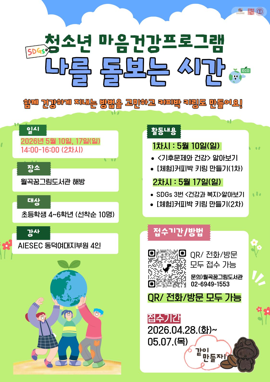커피찌꺼기로 키링을 만든다구?☕ 손으로 직접 만들며 함께 건강하게 지내는 법을 고민하고 📅일시: 2026년 5월 10일(일), 5월 17일(일) 14:00~16:00 📍장소: 월곡꿈그림도서관 해방 😀 대상: 초등학생 4~6학년(선착순 10명) 💕 강사: AIESEC 동덕여대지부 지부원 4명 📝 접수방법: QR접수, 전화, 방문 접수 모두 가능! 접수기간: 2026.04.28.(화)~05.07.(목)