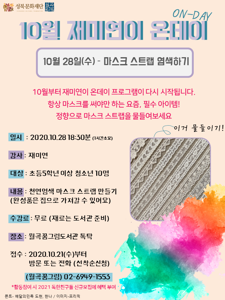 정향으로 마스크 스트랩을 물들여보세요 *오프라인으로 진행됩니다.:) 문의 02-6949-1553 (월곡꿈그림)