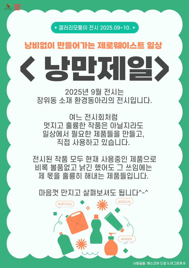 장위동 환경동아리 <낭만제일> 작품들로 구성된 이번 전시는 제로웨이스트를 실천하며, 버려지는 자원을 창의적으로 재활용하여 만든 실용적인 제품들을 소개합니다.