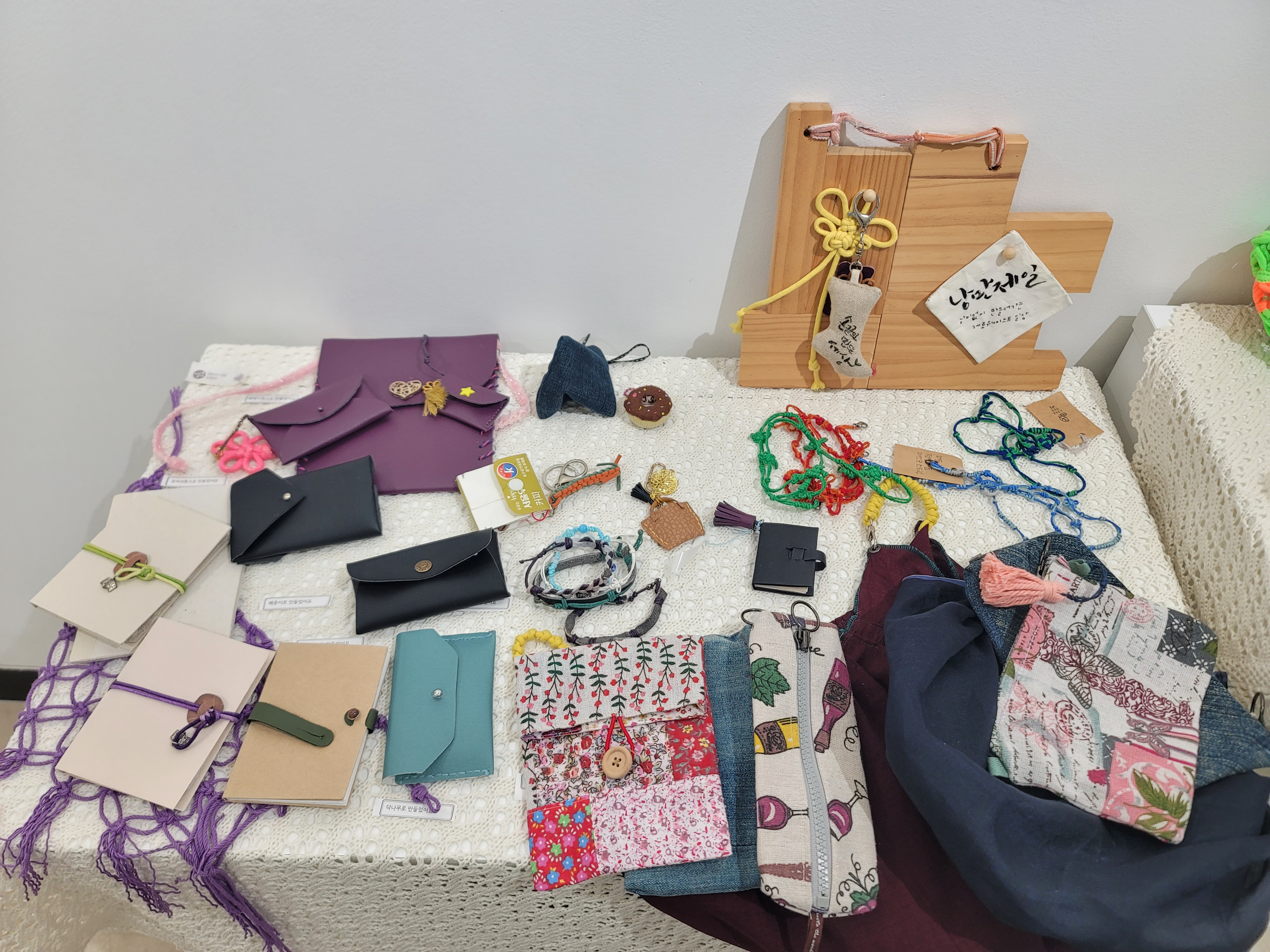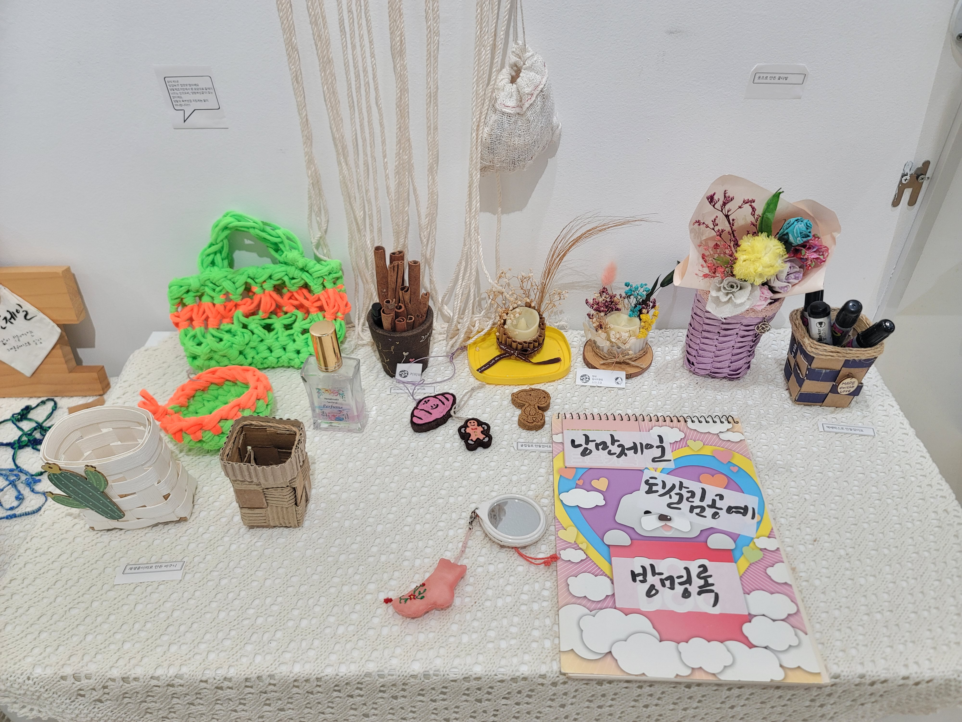 *주요 활동 핸드메이드 공예: 재활용 매듭공예, 라탄공예, 가죽공예 ‘되살림 공예’: 리폼 & 수선 교육, 폐기물 재활용 친환경 제품: 삼베, 린넨, 대나무 등 자연 분해 재료 사용 *전시 제품은 자유롭게 만지고 살펴보세요!