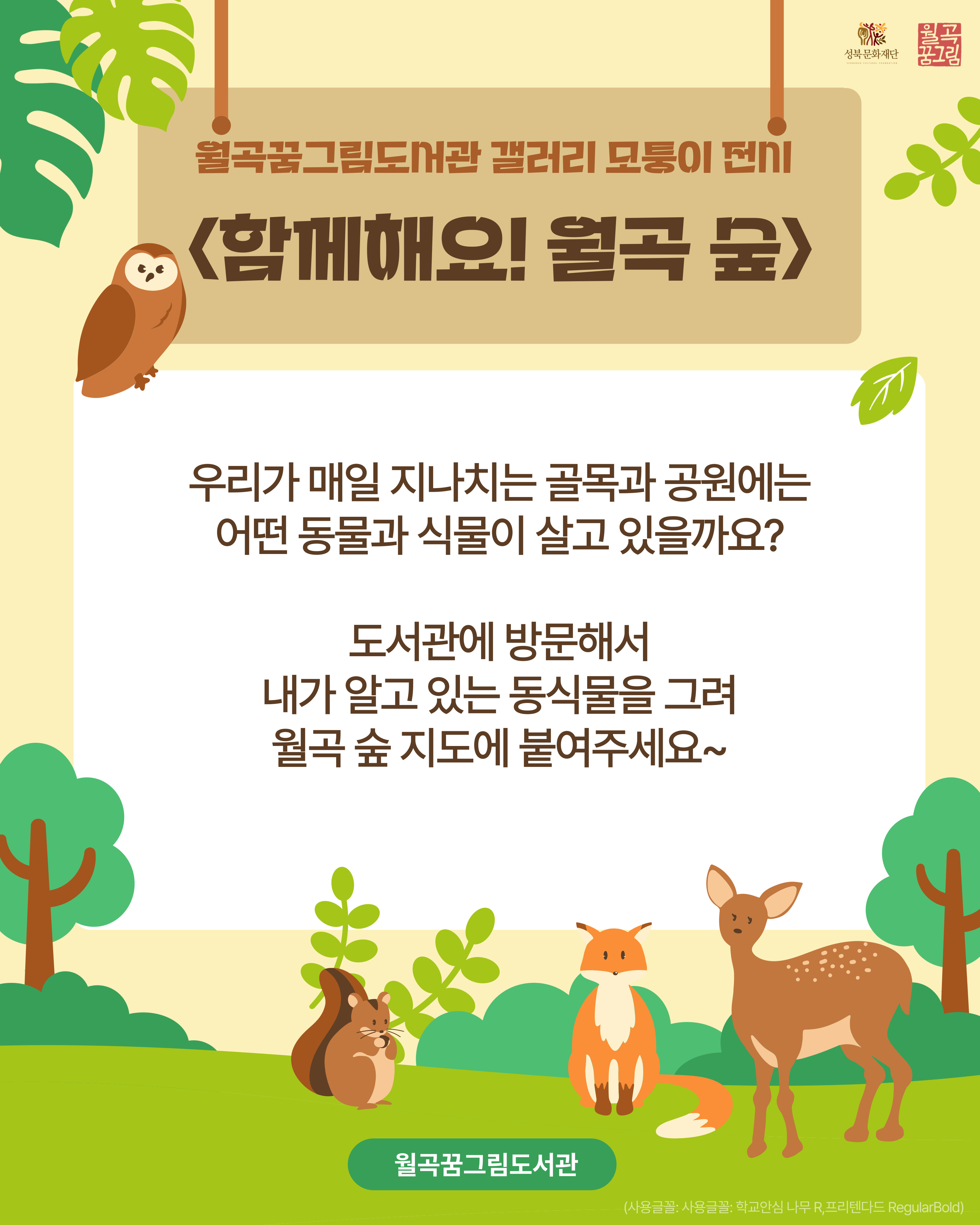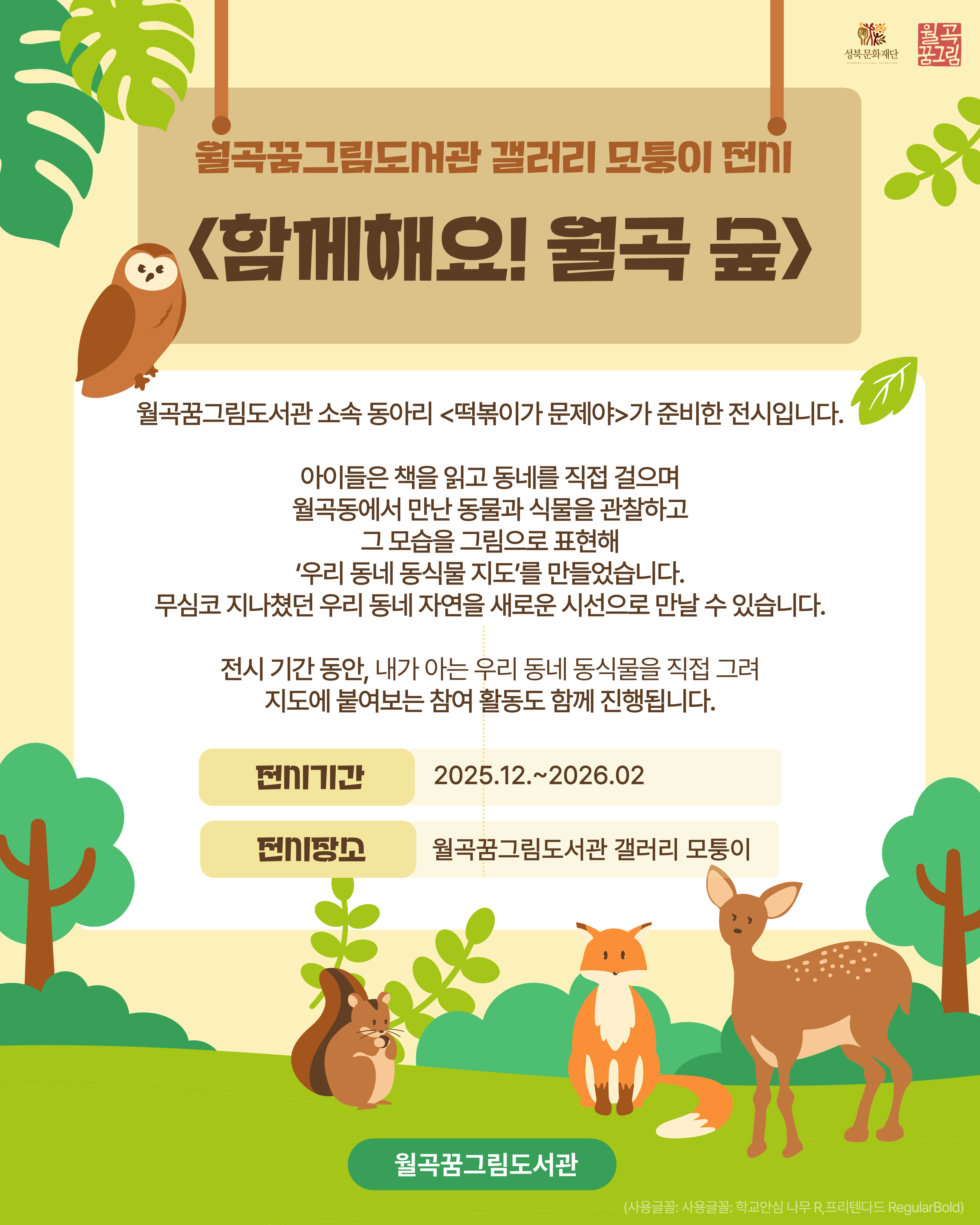 [전시] 월곡꿈그림도서관 갤러리 모퉁이 with 떡볶이가문제야 <함께해요! 월곡 숲>(12~2월) 《함께해요! 월곡숲》 ▶ 전시 기간 | 2025년 12월 ~ 2026년 2월 ▶ 전시 내용